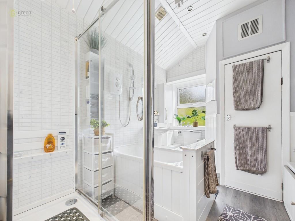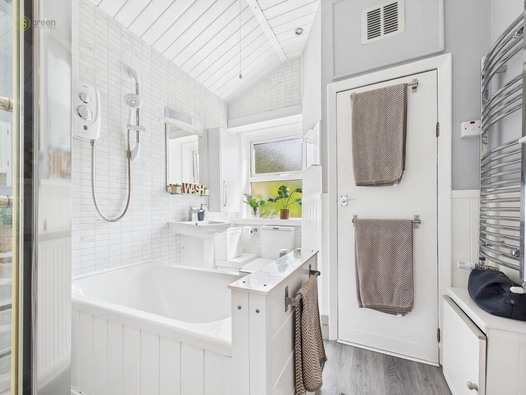 BATHROOM 9' 11" x 7' 3" (3.02m x 2.21m) A spacious room with separate shower cubicle, electric shower, spotlights, mosaic effect laminate wall covering, tub bath wit second electric shower, wc, floating sink, window to rear, airing cupboard, radiator, heated towel rail.
