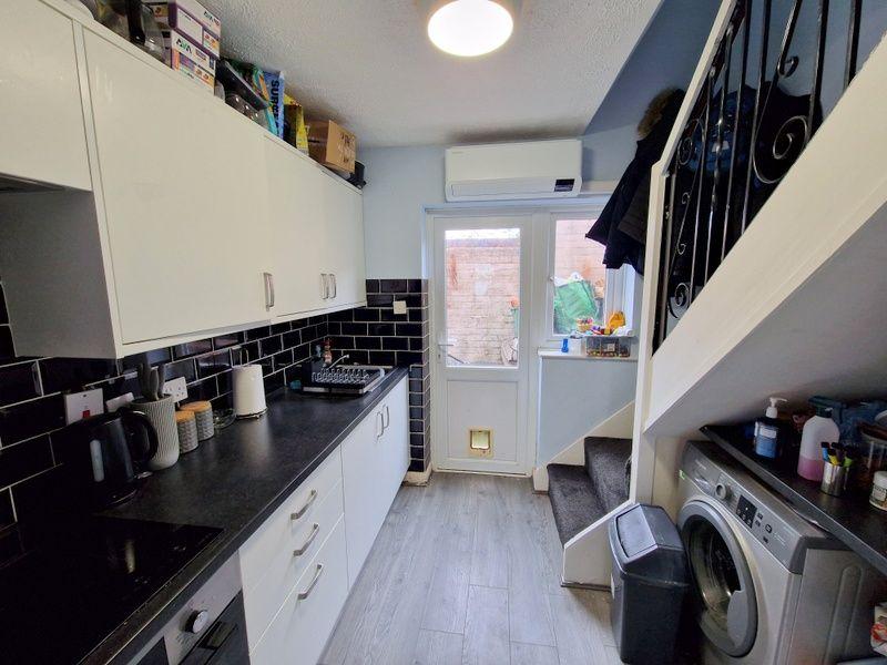 Fitted with patterned worktops with tiled surrounds; cupboards and drawer units beneath and inset sink unit with mixer tap; ceramic electric hob with extractor hood over; built in oven below; wall mounted cupboards; plumbing for automatic washing machine beneath further worktop; space for fridge/freezer; Samsung air conditioning unit for both hot and cold air; double glazed window and door to rear aspect; stairs rising to:
