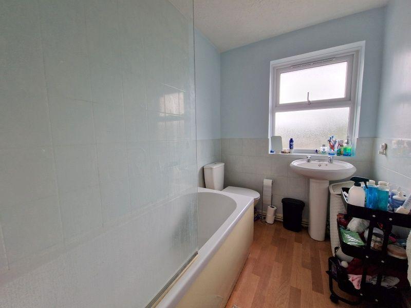 Comprising bath with shower unit over; shower splash screen; pedestal wash hand basin; WC; double glazed window with patterned glass; tiling to splash prone areas; heated towel rail.