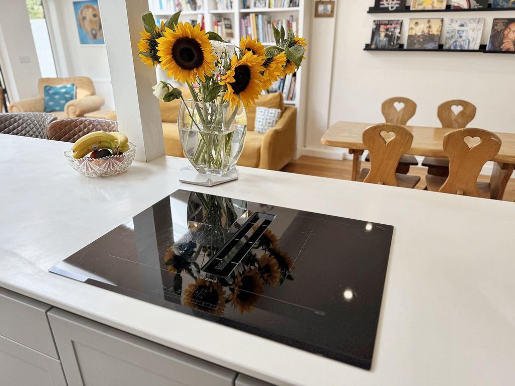 The lounge is a cosy retreat, with a feature fireplace and wood burner taking centre stage – perfect for curling up on winter evenings. Yet it’s the open-plan kitchen, dining and family room that truly defines this home. Flooded with natural light from three side windows, dual aspects and bi-fold doors, the space connects seamlessly to the garden beyond. A stylish kitchen, complete with Bosch appliances and a sociable breakfast bar, flows into the dining and family areas – creating the perfect backdrop for everything from weekday suppers to lively weekend gatherings.