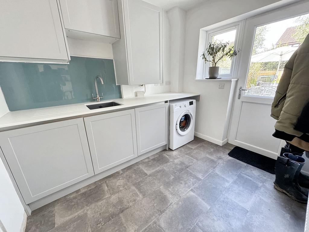 Matching the kitchen in style, with additional cupboards, work surface, sink with mixer tap, glass splashback, wall-mounted gas boiler, radiator, spotlights, rear door and window.
