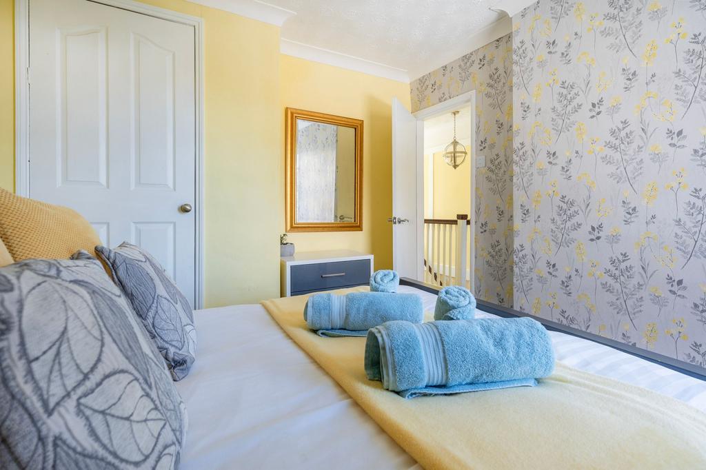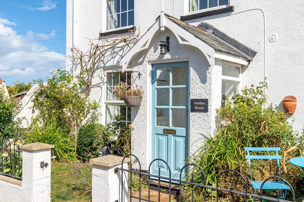 - Inviting façade featuring symmetrical sash windows, a pitched porch, and a colourful front door, framed by a quaint pathway and established flower beds