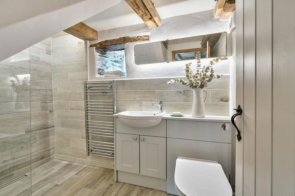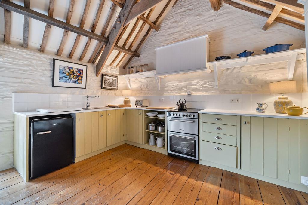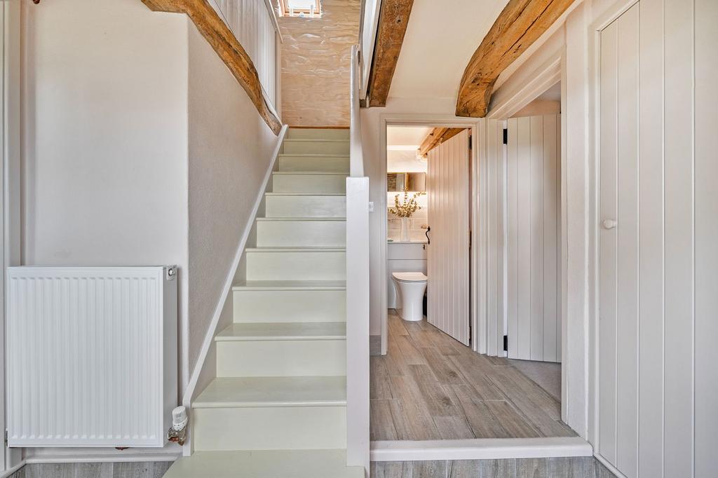 Accommodation - The property benefits from a reverse-level layout designed to make the most of the countryside views. On the ground floor, the entrance hallway leads to the master bedroom with French doors opening onto the garden, a further double bedroom with fitted wardrobes, and a contemporary shower room with underfloor heating. Upstairs, the spectacular open-plan kitchen and living space is a true feature, with vaulted ceilings, exposed beams, and a wood-burning stove creating a warm, inviting atmosphere. The modern kitchen and generous dining area provide the perfect space for family life and entertaining.