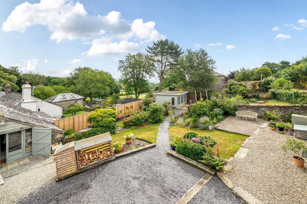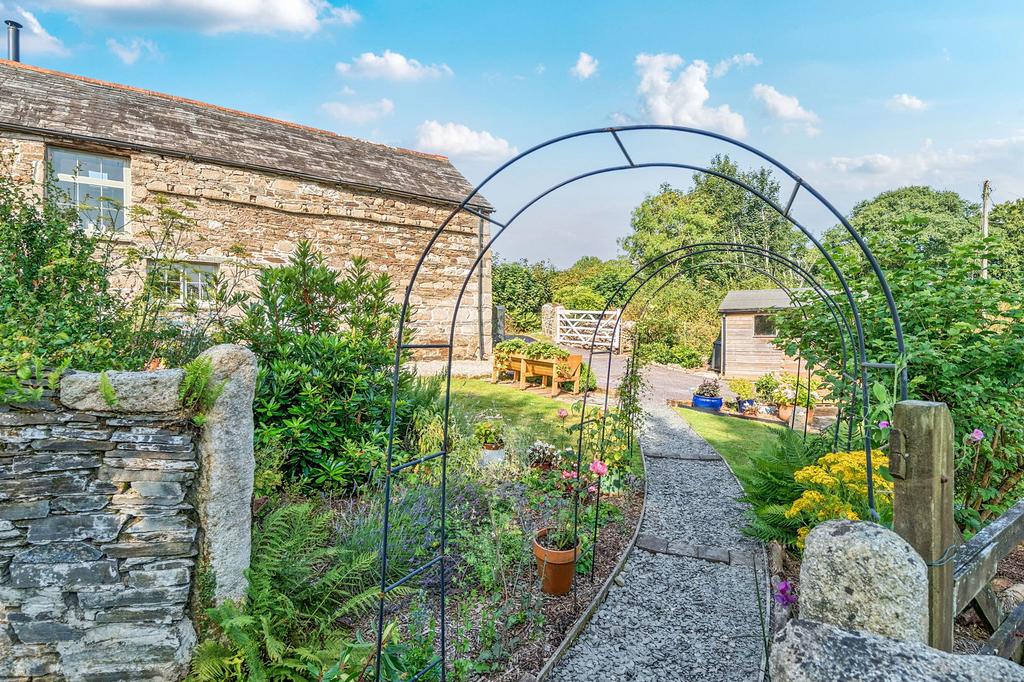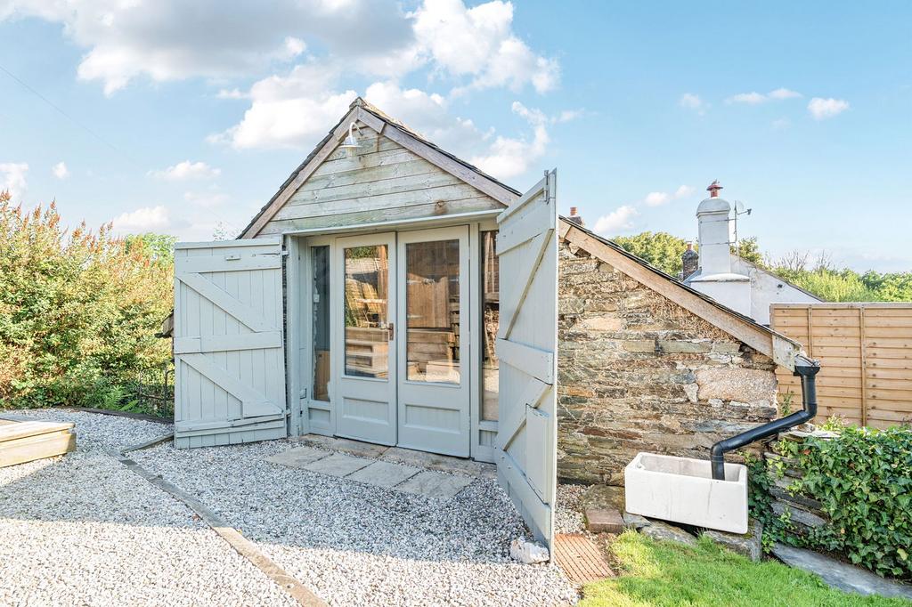Outside - The property is approached via a wooden gate opening onto a private driveway with ample parking. The beautifully landscaped gardens extend to approximately 0.2 acres, offering lawns, mature planting, and a selection of private seating areas with countryside views. The gravelled terrace creates a perfect setting for alfresco dining. Versatile outbuildings include a large storage shed, a converted dairy barn currently used as guest accommodation/home office, and a generous studio with its own decked area—ideal as a hobbies room, workspace, or further entertaining space.