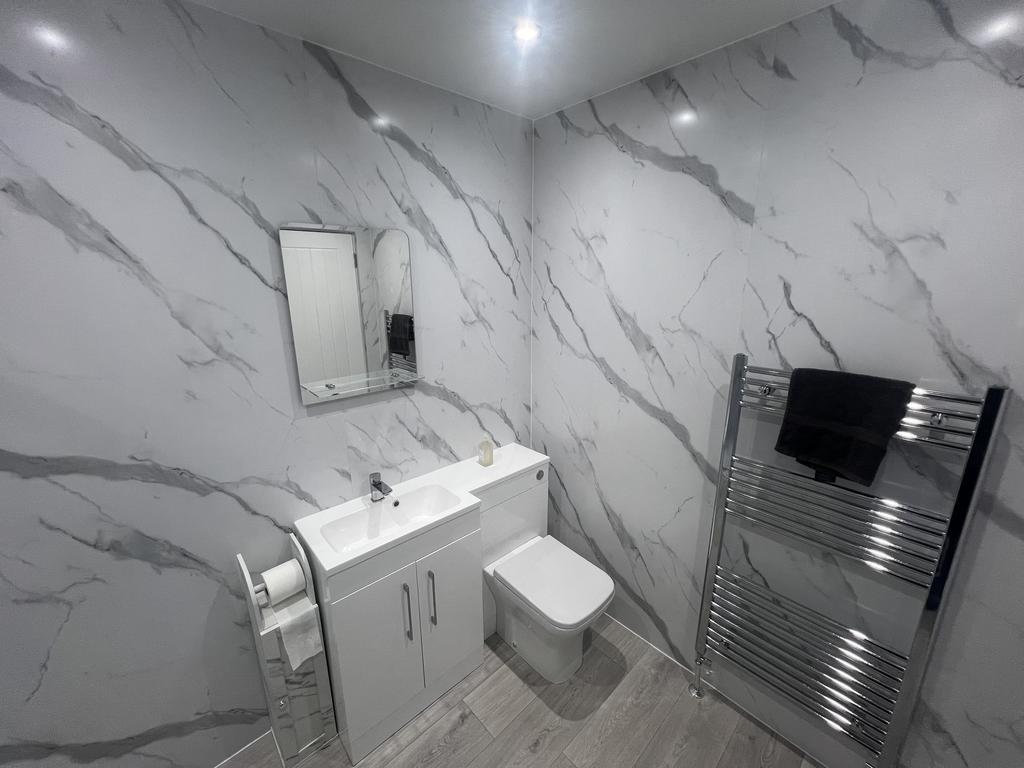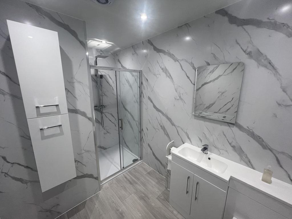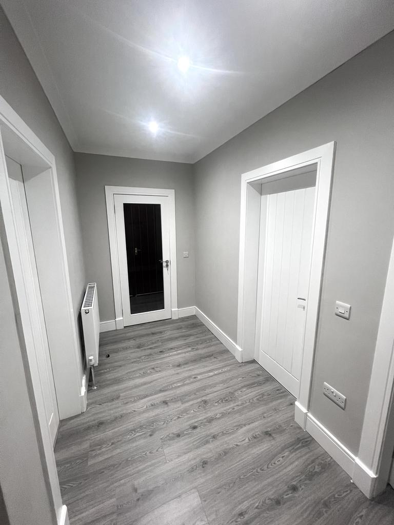 At the heart of the property is a large entrance hall, providing a welcoming and central space from which all other rooms flow. The home features a fully fitted modern kitchen, designed with style and practicality in mind, three generously sized bedrooms, and a sleek contemporary shower room.