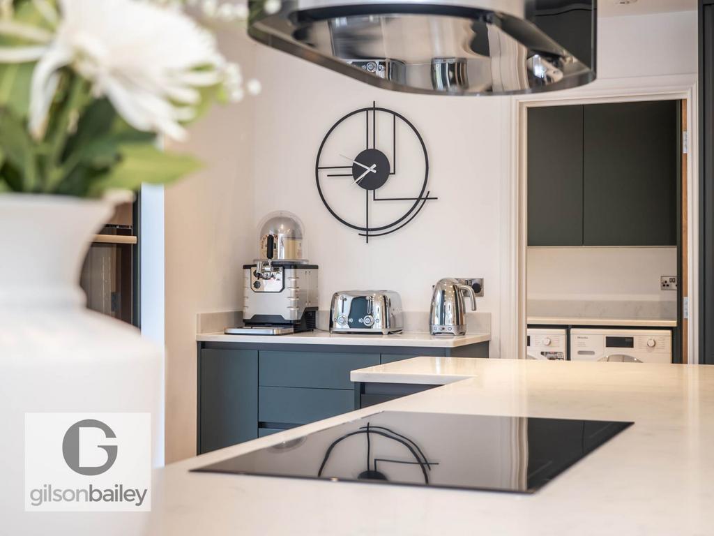 The stylish kitchen is the heart of the home, complete with sleek cabinetry, AEG fitted appliances and a large island, perfect for entertaining.