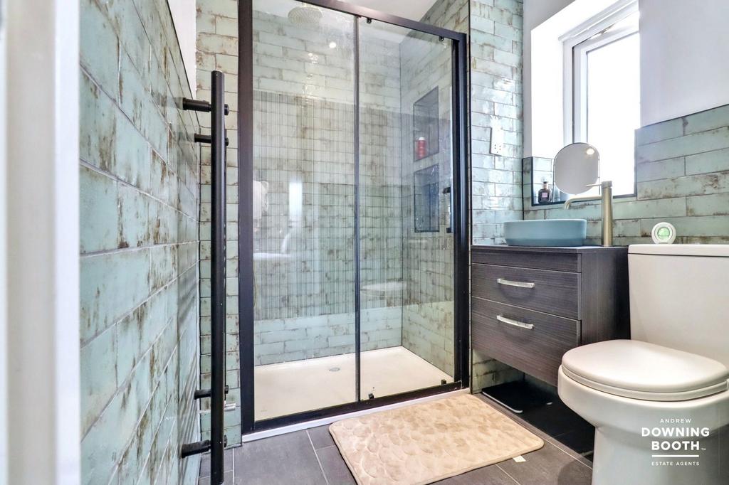 A contemporary en-suite is appointed with a low-level flush WC and a wash hand basin set within a vanity unit, complete with a brass mixer tap. The walk-in shower features sliding doors, brass shower fittings, and a brass rainfall shower head. Additional features include tiled flooring, recessed ceiling spotlights, a side-facing UPVC double-glazed window, part-tiled walls, and a contemporary anthracite heated towel rail.