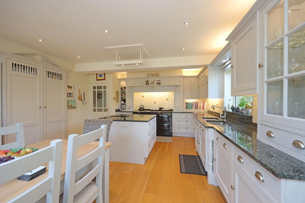 Returning to the dining hall a further open inner hallway links all of the receptions and dining kitchen. There is a ground floor WC and under stairs access to a large cellar which houses the central heating system. At the far end of the inner hall is a generous office/study (potential further sitting room or bedroom) with a large square bay window overlooking the rear courtyard. The principal living room is situated at the opposite end of the inner hallway and enjoys further views over the front garden from sash windows with additional aspect to the side. The room is fitted with a feature fireplace having stone surround/marble hearth that houses a gas fire from LPG supply. To the rear of the property is a large well planned and extended family dining kitchen with a partially glazed vaulted ceiling and picture window outlook incorporating central patio doors opening onto the lower rear garden patio. Additional windows are located to the side elevation. The bespoke fitted kitchen is fully equipped with a full range of various cupboard/drawer units and has an integrated dishwasher and granite work tops with twin sink and waste disposal unit. There is also larder shelving and built-in larder fridge/freezer and a matching island with further base units having fitted combination microwave and standard oven and two ring induction hob that supplements a large freestanding 4-oven AGA oil fired cooking range. Oak flooring from the kitchen continues through to a rear hall with a rear facing window and external rear access door leading to a small courtyard and the driveway. From the rear hall with continuation of oak flooring is a well appointed utility with twin sink, further base/wall units and space/provision for washing/drying facilities. There are two large floor to ceiling storage cupboards with shelving built into the utility.