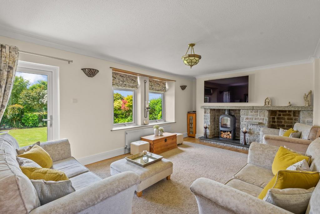 The farmhouse has been sensitively modernised while retaining its period charm. A bespoke kitchen features granite worktops, gas hob and a unique granite detail dating back to 1631. The open-plan dining and sitting room enjoys far-reaching valley views and a log-burning fireplace, with a second reception offering use as a snug, study or additional bedroom. Upstairs, the principal suite boasts an en-suite shower room and walk-in wardrobe, accompanied by two further bedrooms and a family bathroom.