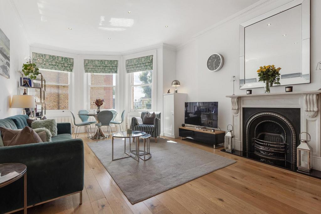 The heart of the home is a spacious kitchen/reception room, with tall ceilings and a curved bay window that brings in exceptional natural light. The open layout offers generous room for both living and dining.