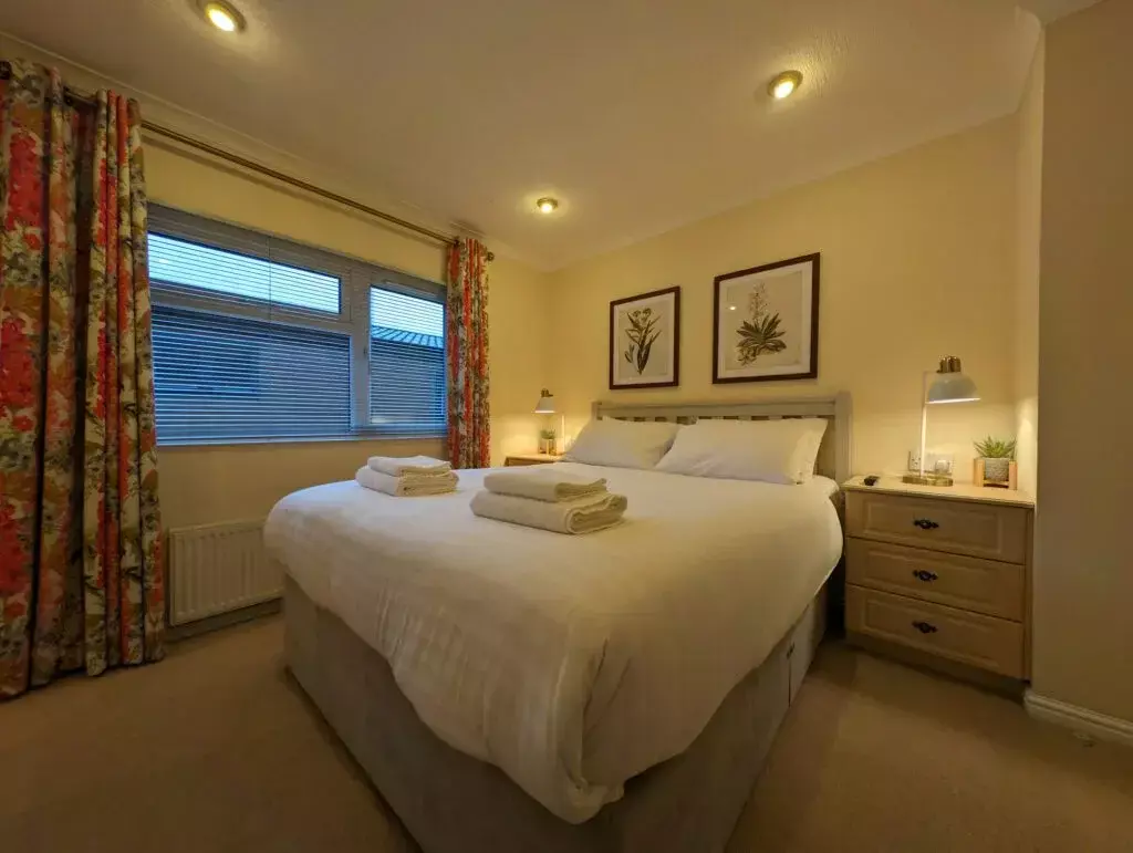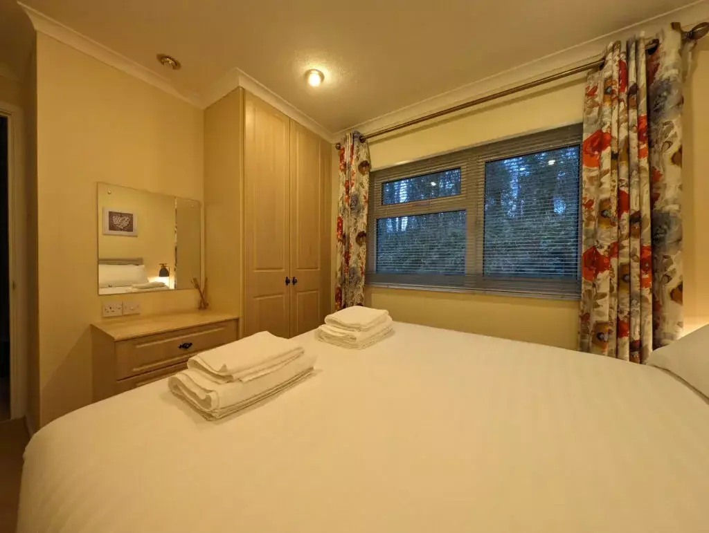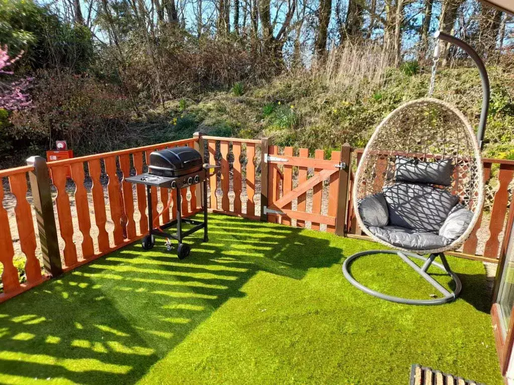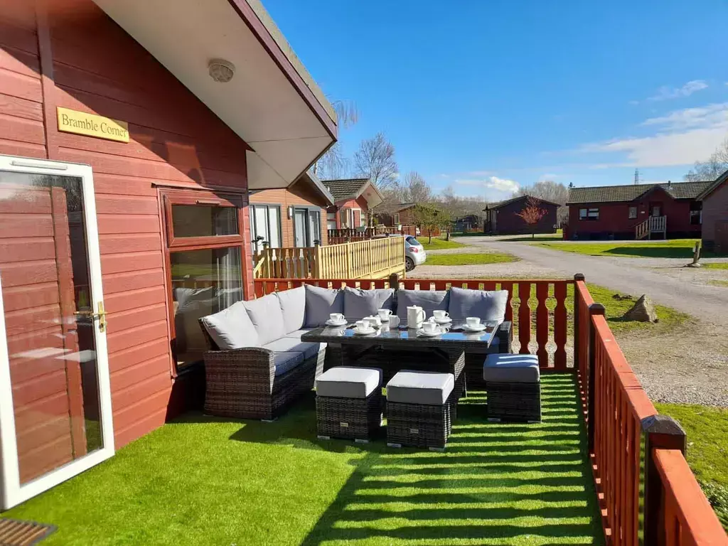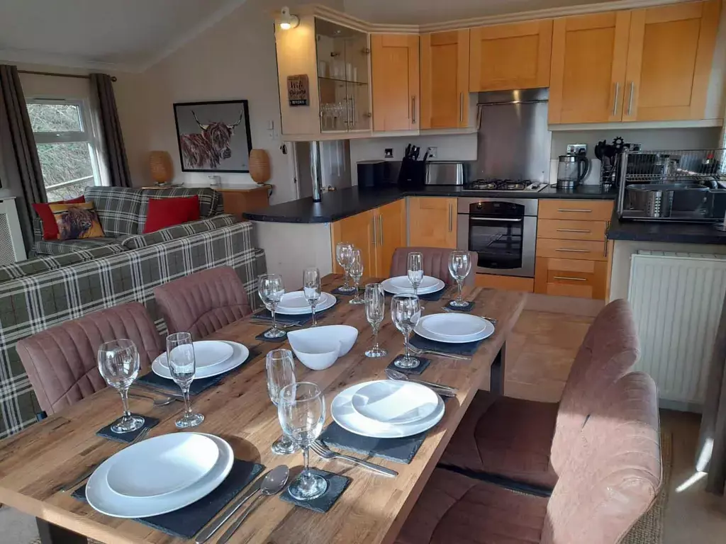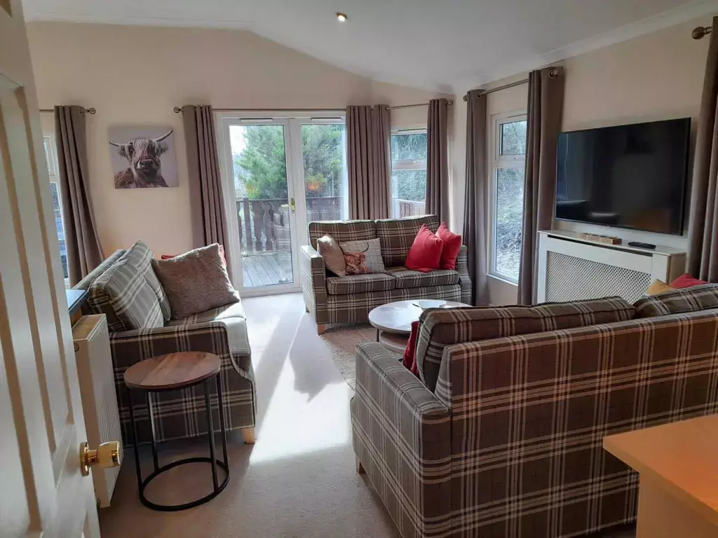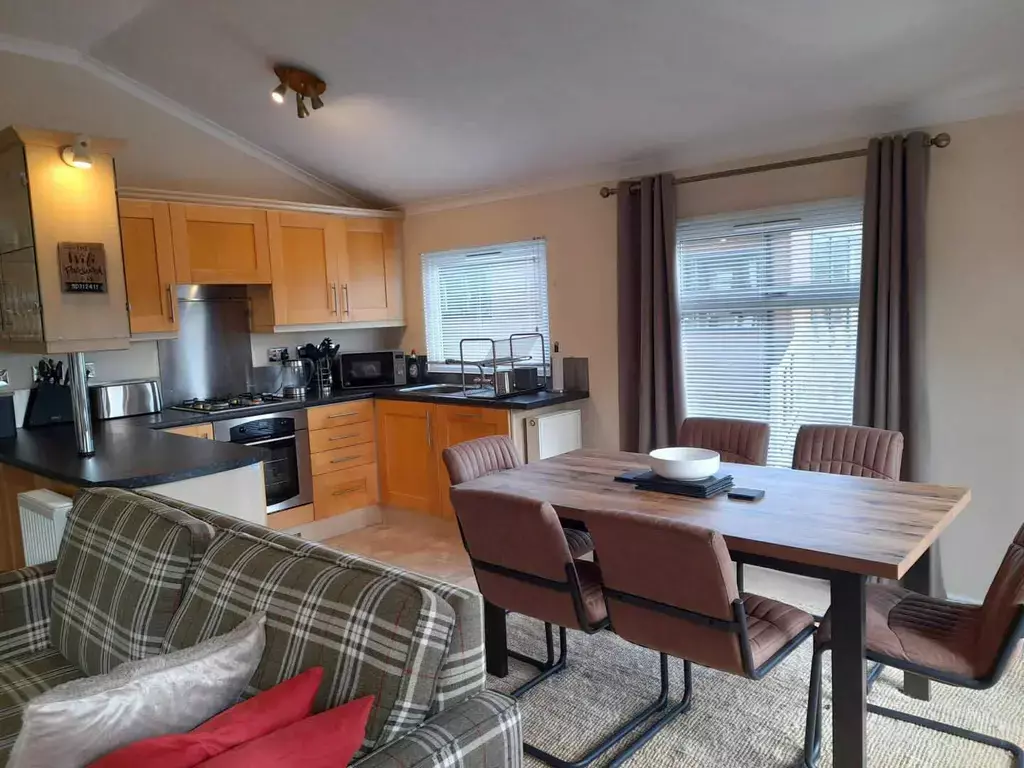 The heart of the lodge is its bright, open-plan kitchen, dining, and living area, designed for seamless socialising and relaxation. The fully equipped kitchen is perfect for preparing meals, and the large windows fill the space with natural light. Step outside onto the private decking, complete with outdoor furniture, where you can unwind and take in the peaceful surroundings.