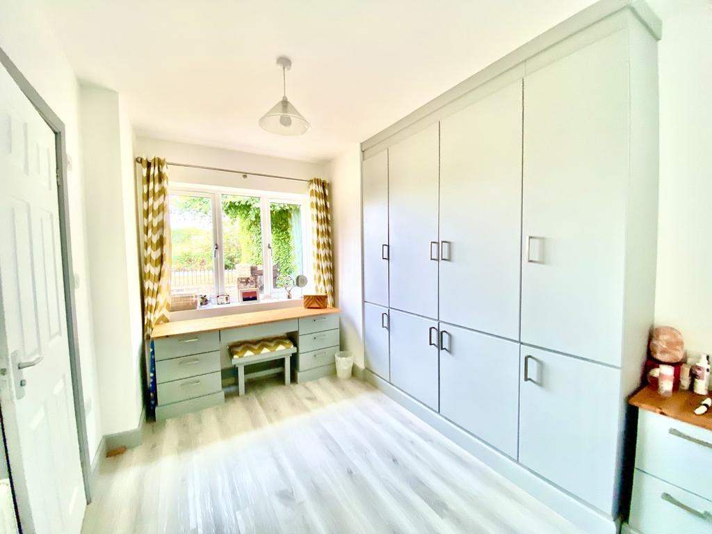 Fitted with a matching range of bespoke hand made wardrobes with pull down clothes rails and storage shelving, concealed pull down hobby/craft table, dressing area, LVT flooring, radiator, replacement PVCu double glazed to front and rear aspect, PVCu double glazed French doors to rear garden, door to: