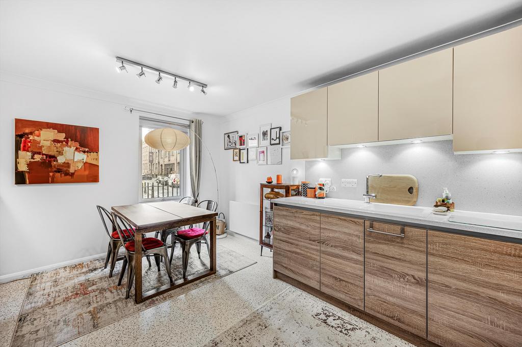 The internal layout features a dine-in kitchen with a large window that floods the space with natural light. The kitchen is fully integrated and finished to a modern specification, complete with contemporary fittings and appliances.