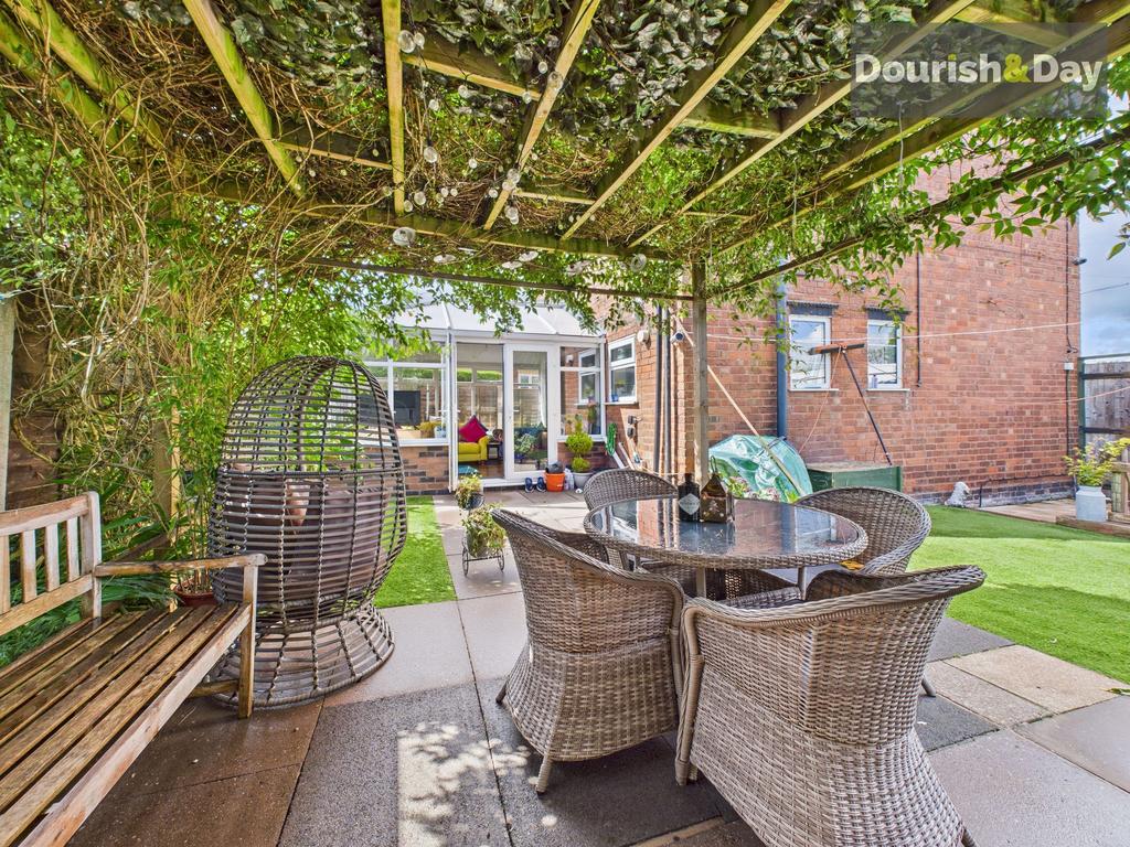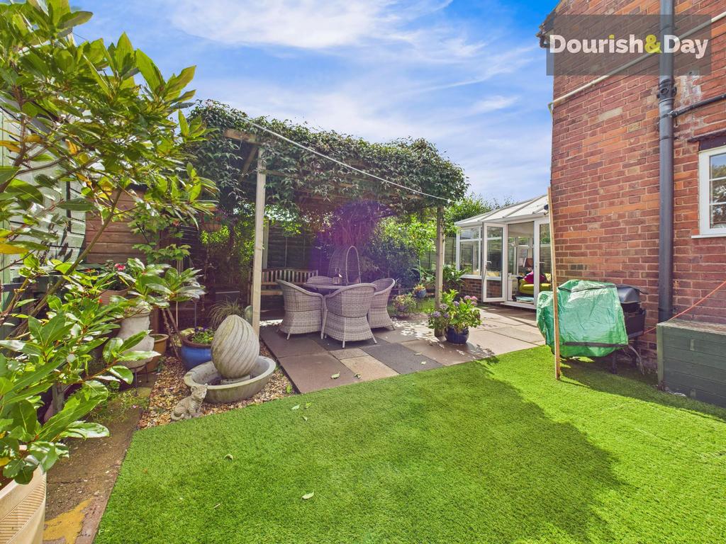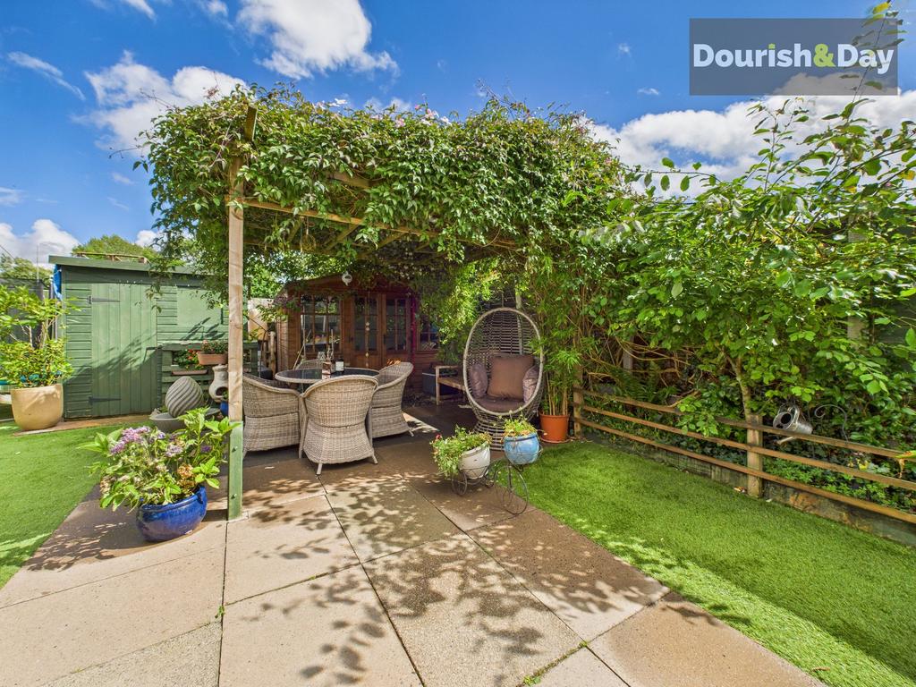Superb low maintenance and private rear garden. Astro turf area, paved patio seating area extending to a timber pergola and additional seating area. Space for storage sheds. Useful wood storage areas. Gated access to the front driveway.