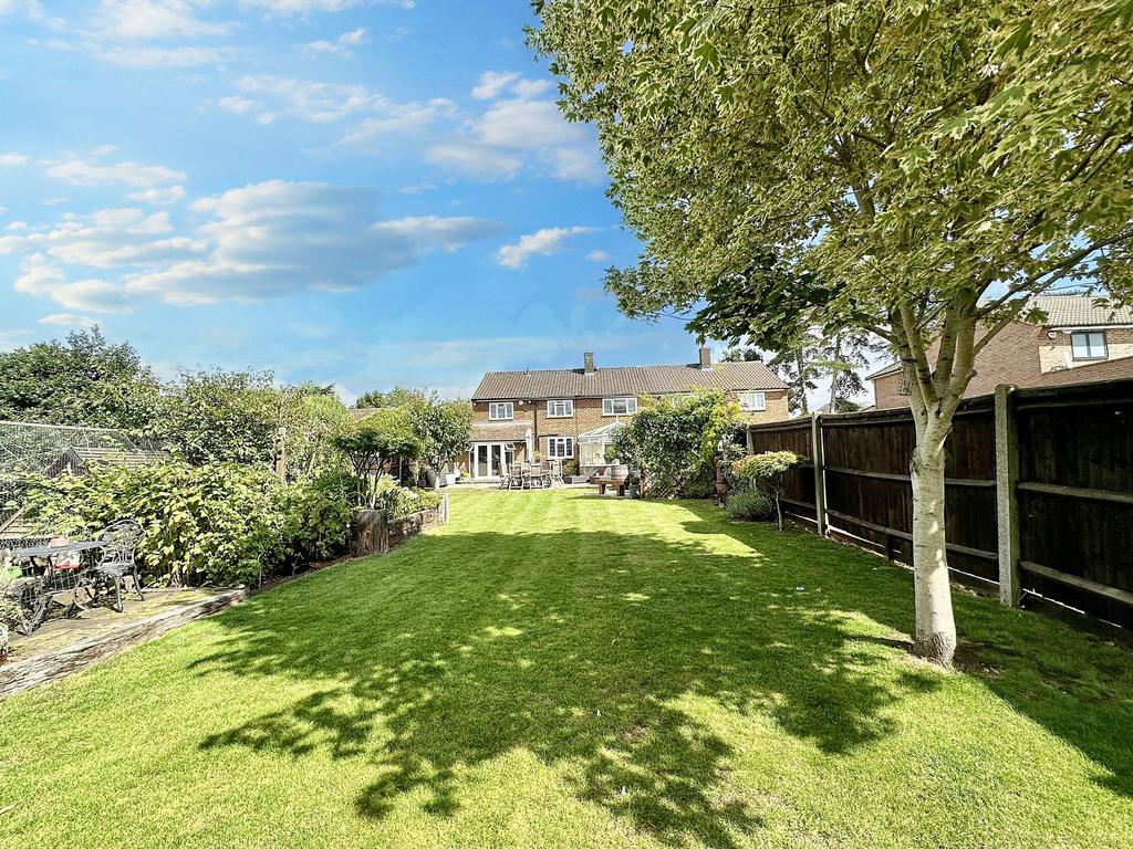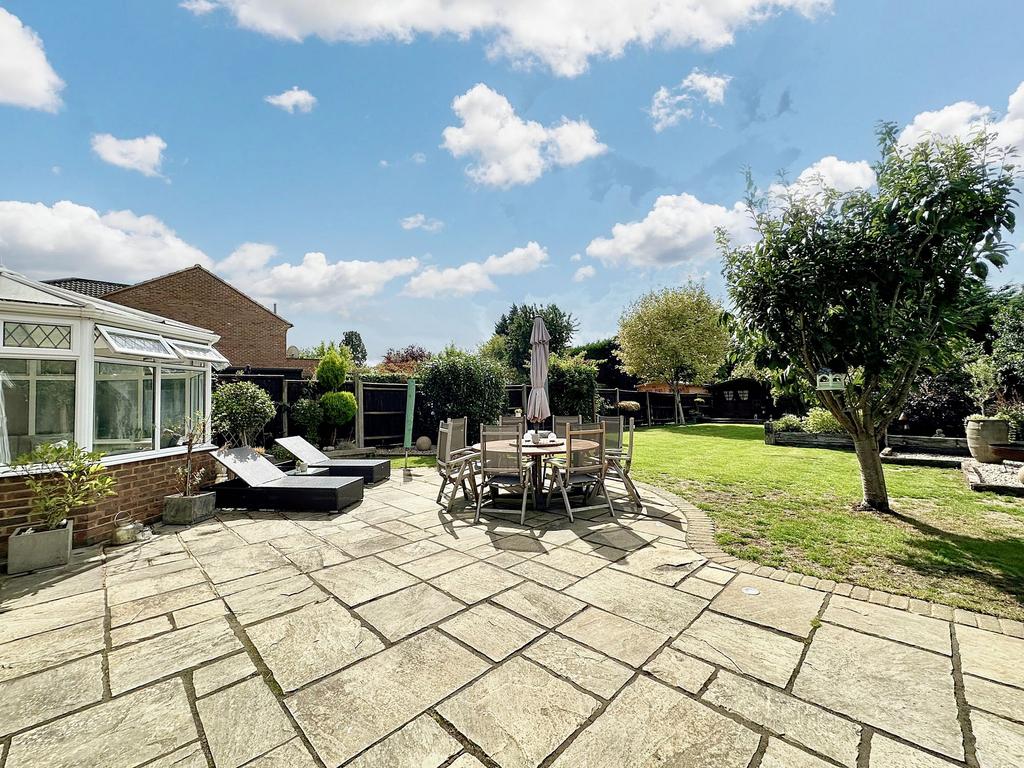 Large garden mainly laid to lawn with mature trees and shrubs. Large curved main patio area. Additional patios positioned for capturing the morning and evening sunshine. Side access to front. Large timber workshop/shed/summer house.