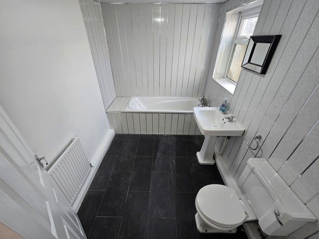 Located on the ground floor. White 3 piece bathroom suite including bath, pedestal sink and low lying toilet. uPVC double glazed windowm central heating radiator. Vinyl flooring.