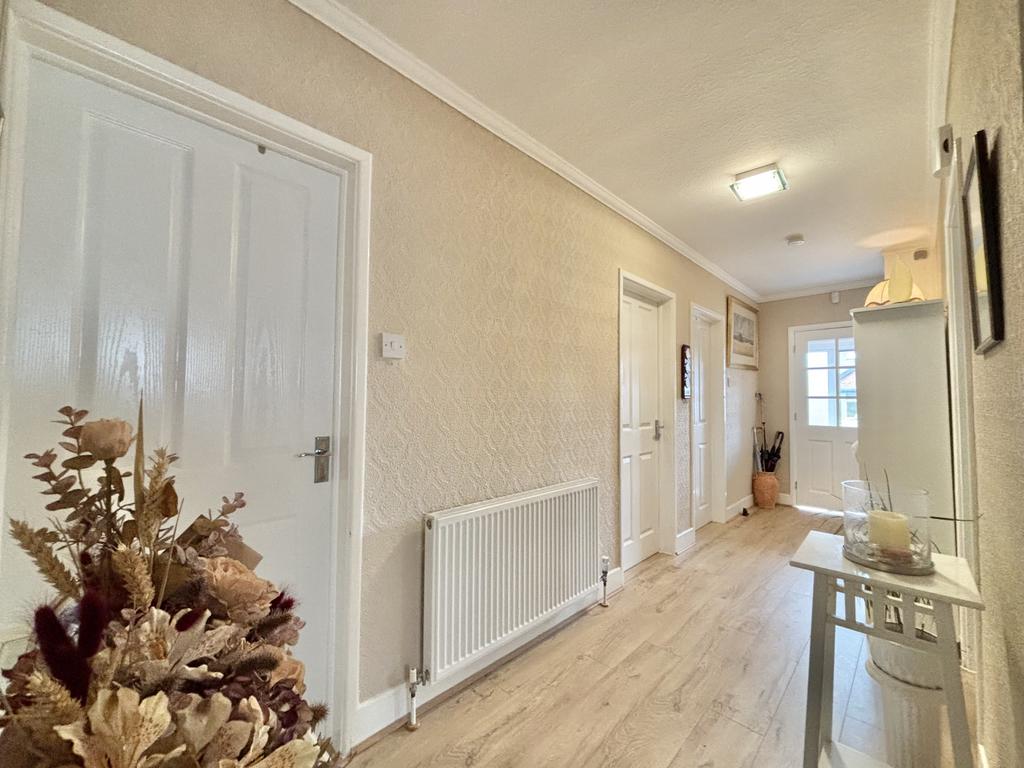 Welcoming entrance hall with a built-in storage cupboard, coved ceiling, and radiator.