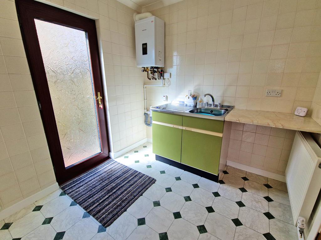 Tile effect vinyl flooring continued. Base unit housing a stainless steel sink unit with mixer tap over. Plumbed for washing machine. uPVC double glazed door to the side elevation. Wall mounted boiler (Fitted 2024 with a 10 year guarantee). Coved ceiling. Radiator. Power points. Double doors to a good sized storage cupboard.