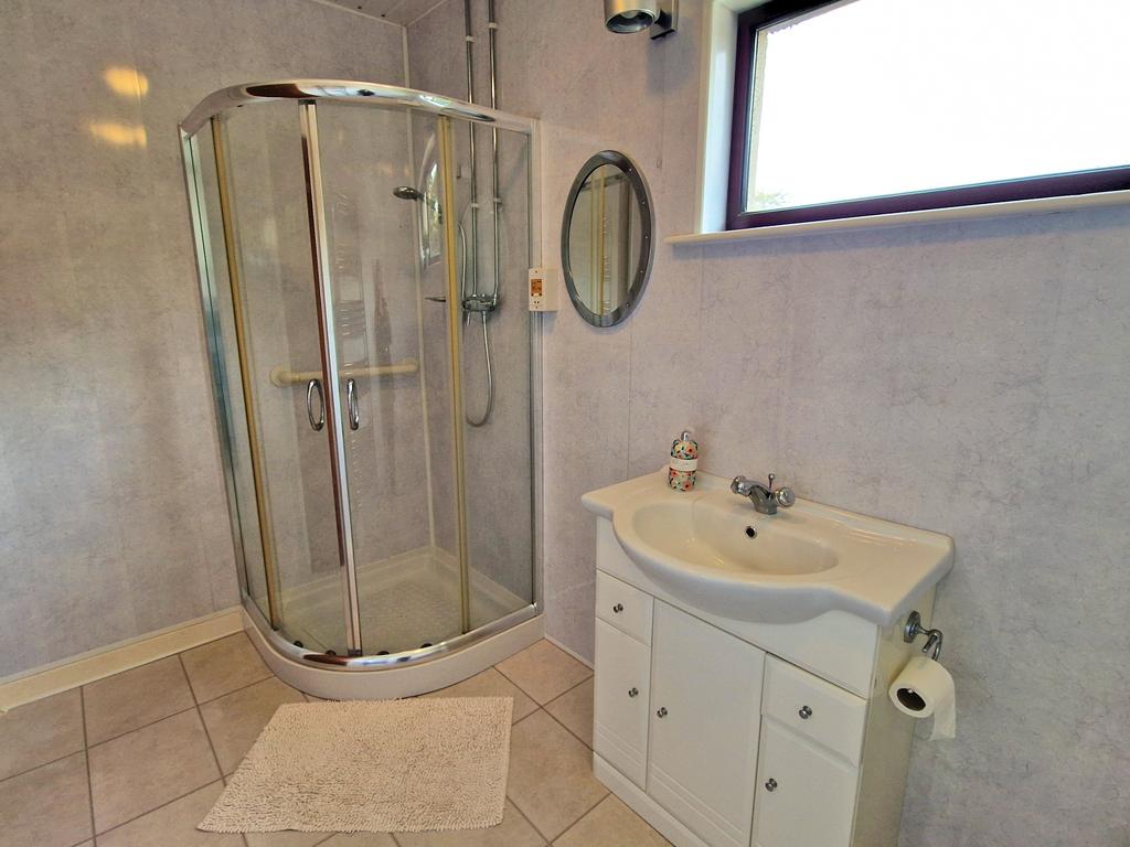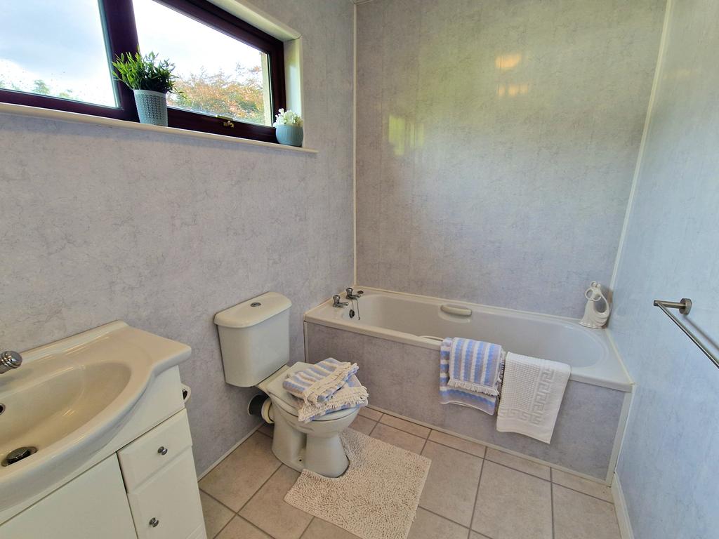 Fitted with a white suite comprising a corner shower enclosure, panelled bath, low level w/c plus a vanity storage cupboard housing the wash hand basin. uPVC double glazed high level window to the side elevation. Tiled flooring. PVC panelled walls. Chrome towel radiator.
