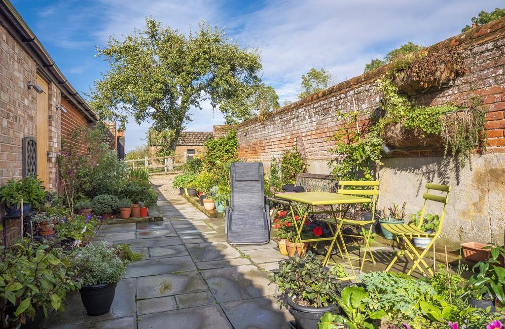 A walled courtyard with paved terrace is currently stocked with a range of potted plants with scope to create a seating area able to maximise the impact of the south-facing side aspect.