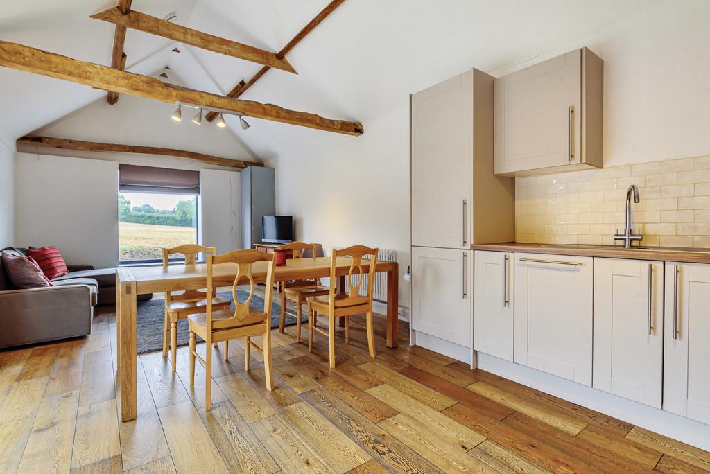 KITCHEN/SITTING/DINING ROOM: 25' 6" x 12' 4" (7.79m x 3.76m) Enjoying a distinctive, open plan dual aspect with window to side affording a southerly aspect and views across rolling farmland and four-panel bi-folding doors opening to the walled terrace. Set beneath a vaulted roofline with wealth of exposed timberwork, crossbeams, stripped oak flooring and central dining space. The kitchen is fitted with a matching range of shaker style soft-close base and wall units with wood-effect preparation surfaces over and tiling above. Stainless steel sink unit with mixer tap over and fitted appliances including a Bosch oven with four-ring Bosch induction hob above and extraction over. Further fitted appliances include an AEG dishwasher. Space for fridge.