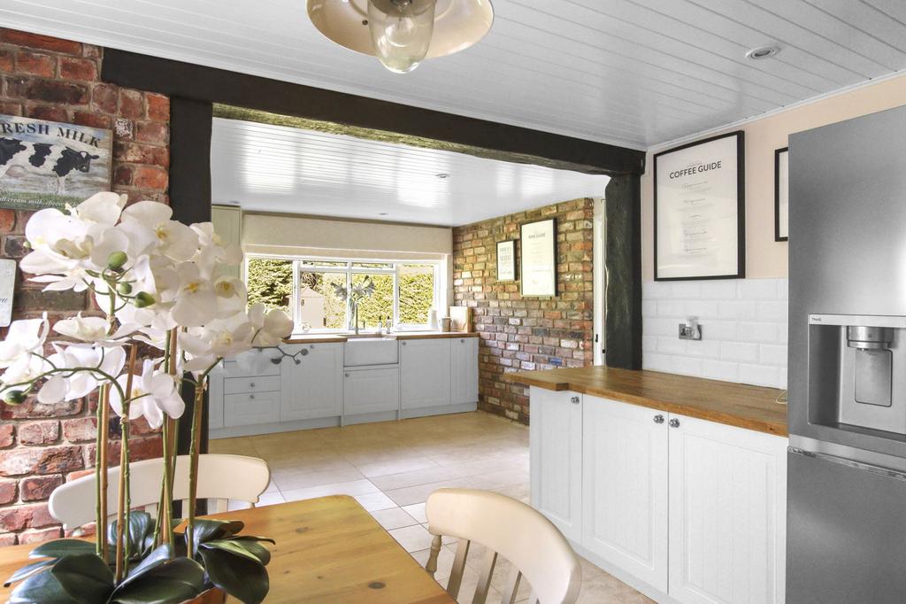 The heart of the home is a recently refurbished open-plan kitchen, complete with modern appliances, utility room, large cloakroom and dining space. The kitchen showcases solid wood countertops, exposed brickwork, and a view over the garden, all bathed in natural light.