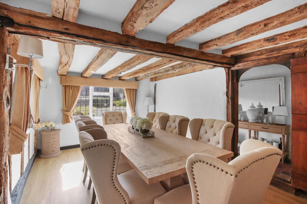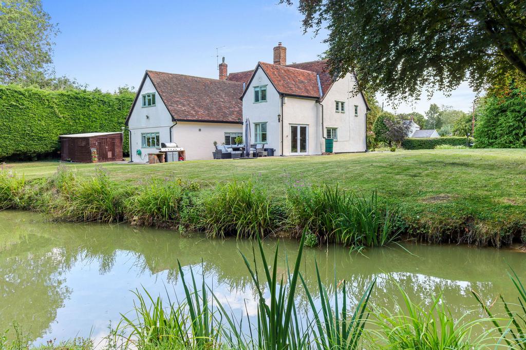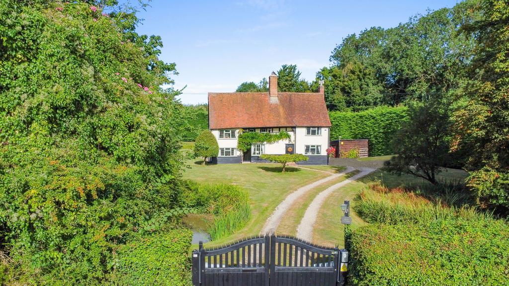 The property is entered through electric gates and is set back off Smiths Green, welcoming you as the garden which is all encompassing, the the moat winding round to the left and a wildlife garden to the right hand side. A driveway leads up to the side of the property. An entrance hall leads to the dining room, living room, kitchen/diner and the first staircase to bedrooms 2,3,4 and the main bathroom. The interior houses three substantial reception rooms, each resonating a distinct character. The first is a cosy living room and separate snug, adorned with a fireplace, exposed beams, and a serene front garden view. The second reception room serves as an inviting dining room, displaying exposed beams, timbers, and brickwork, all overlooking the front garden and green. The third reception room, perfect as a home office, comes with a picturesque garden and moat view and direct access to the garden.