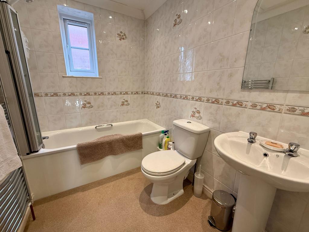 On the ground floor, the accommodation includes a cloakroom/WC with UPVC obscure double glazed window, wash hand basin with fitted storage beneath, heated towel rail, and part tiled walls. The spacious lounge/diner enjoys a bay-fronted UPVC double glazed window to the front aspect, wall lights, and a feature fitted electric fire with an attractive hearth, backing, and wooden surround. The dining area comfortably accommodates a table and chairs for entertaining, with sliding patio doors opening directly onto the rear garden.