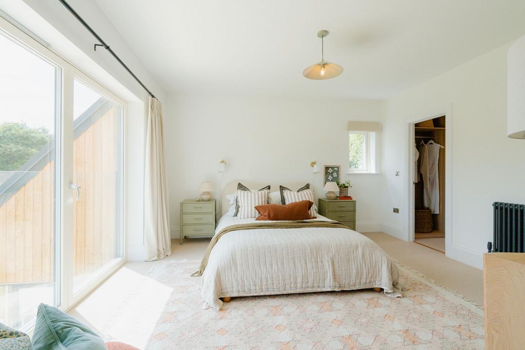 Throughout, the attention to detail is excellent. With sustainable materials including the larch cladding, wool carpets and wood flooring really adding to the feel of luxury. The layout is very generous, particularly on the ground floor and we love the light flooding in from the south into the main living areas, not to mention the double height entrance with floor-to-ceiling windows on both ground and first floors, framing the view beyond. The living spaces are flexible with a choice of chill out or working areas, plus the stylish open plan kitchen with its premium appliances, large island and quartz tops is the hub of the home. The large main living room with its high vaulted ceiling and doors onto the rear patio is the perfect place to unwind or entertain. The bedrooms are all doubles, with an ensuite shower room to bedroom two as well as the master bedroom with it’s wide glass Juliette balcony, walk in dressing room and luxury ensuite with a shower and bath, it's a sanctuary to enjoy.