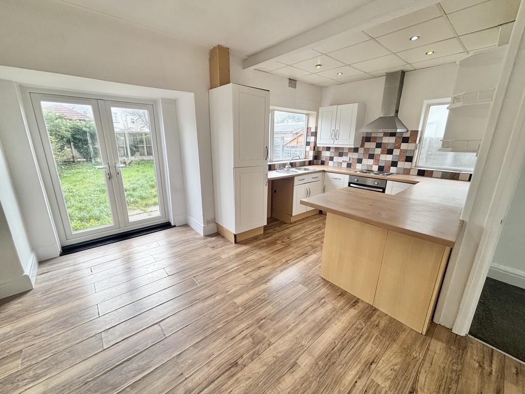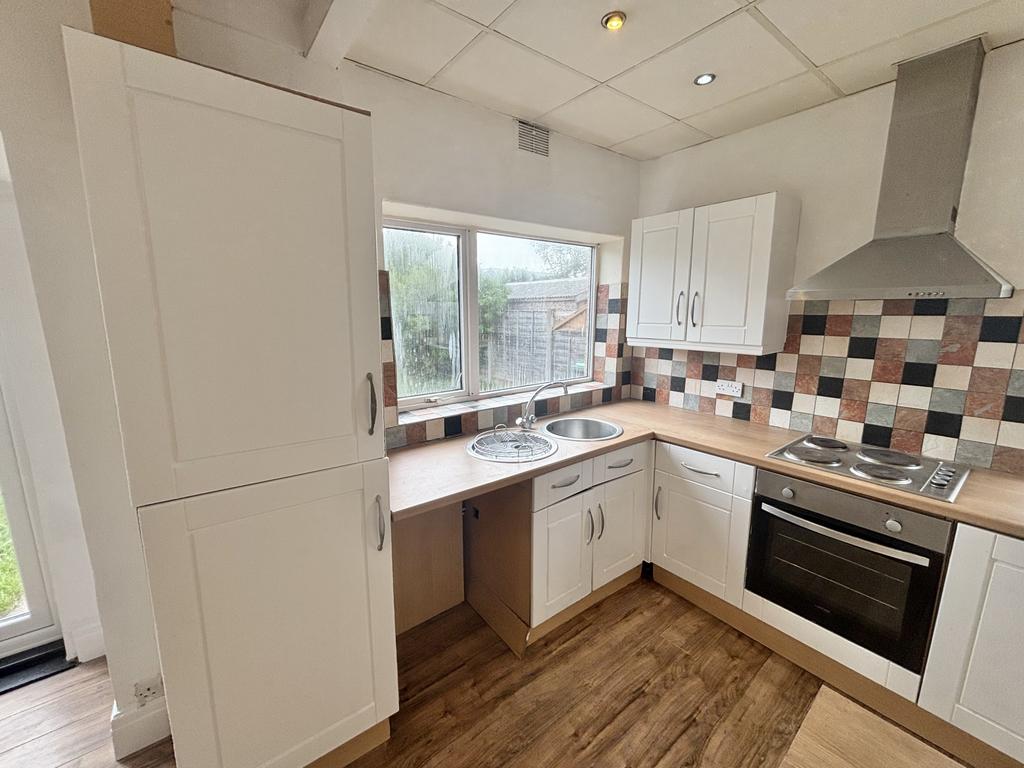 Two UPVC double glazed windows and door leading to the rear garden. Fitted kitchen with a range of wall and base units with complementary work surface, integrated oven, hob, extractor fan, stainless steel sink, drainer with mixer tap, plumbed for washing machine, wall mounted boiler in larder unit and radiator.