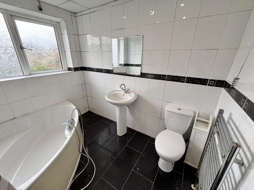 UPVC double glazed opaque window to rear aspect, panelled corner bath with shower, low flush w.c, pedestal wash hand basin, chrome heated towel rail and fully tiled walls.