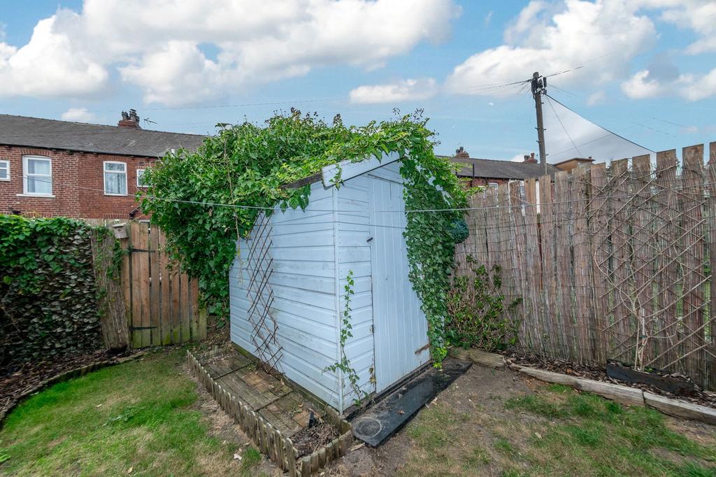 The property boasts a walled buffer garden at the front, an enclosed rear garden with a nice sized lawn area and shed for storage.