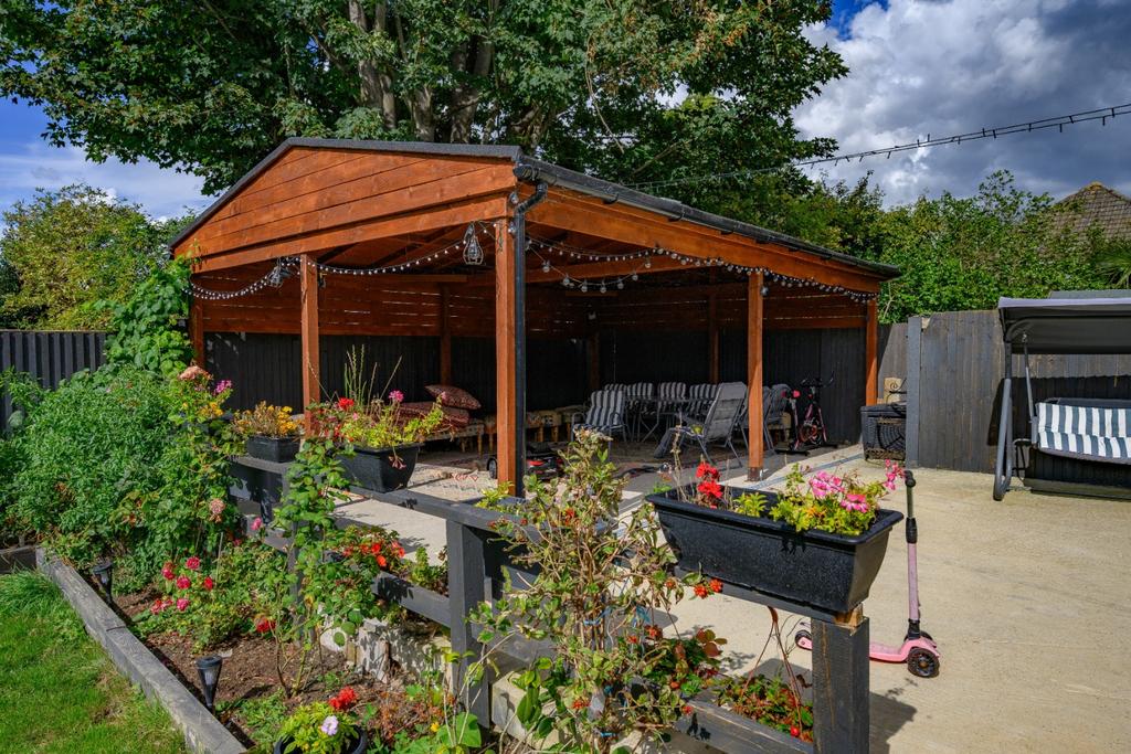 Outside, the exceptional rear garden stretches nearly 90 feet, offering remarkable depth and versatility. Thoughtfully zoned for year-round enjoyment, it features sun-drenched lawns, a dedicated play or dining area, and a large wooden pergola retreat—perfect for hosting, relaxing, or unwinding in all seasons. The front garden complements the home’s elegant façade, framed by a sweeping carriage in and out driveway.
