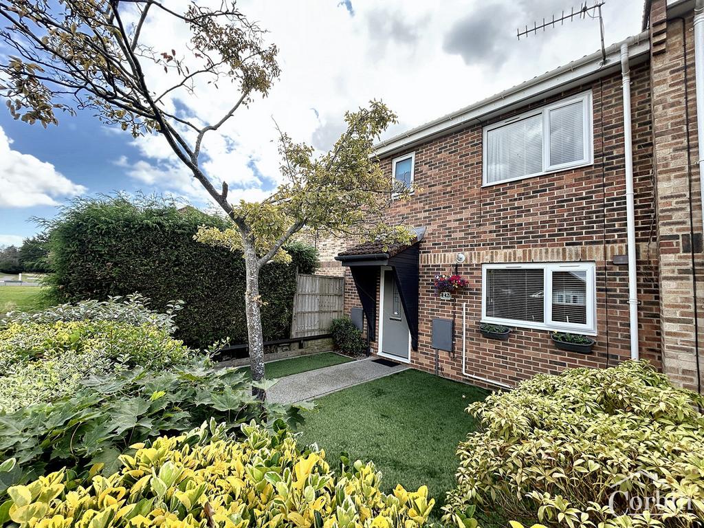 The low-maintenance frontage is beautifully laid with artificial lawn, bordered by charming flowerbeds. A sleek resin pathway leads to the sheltered front door under a storm porch, creating a welcoming first impression.