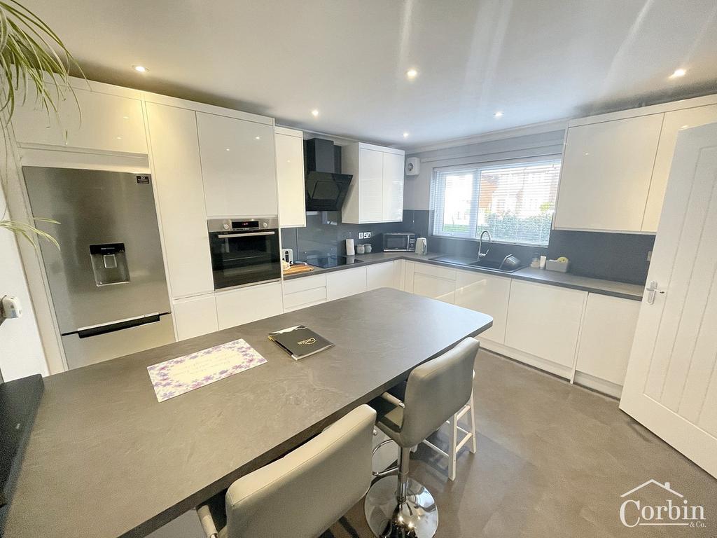 The modern kitchen/breakfast room at the front of the property is a real highlight, featuring high-gloss white units paired with complementing work surfaces. It comes fully equipped with an integrated washing machine, dishwasher, high-level oven, hob with cooker hood over, island and plinth lighting. There is also space for an upright fridge/freezer, making this a functional yet stylish space for cooking and dining. Boiler was replaced in February 2025.