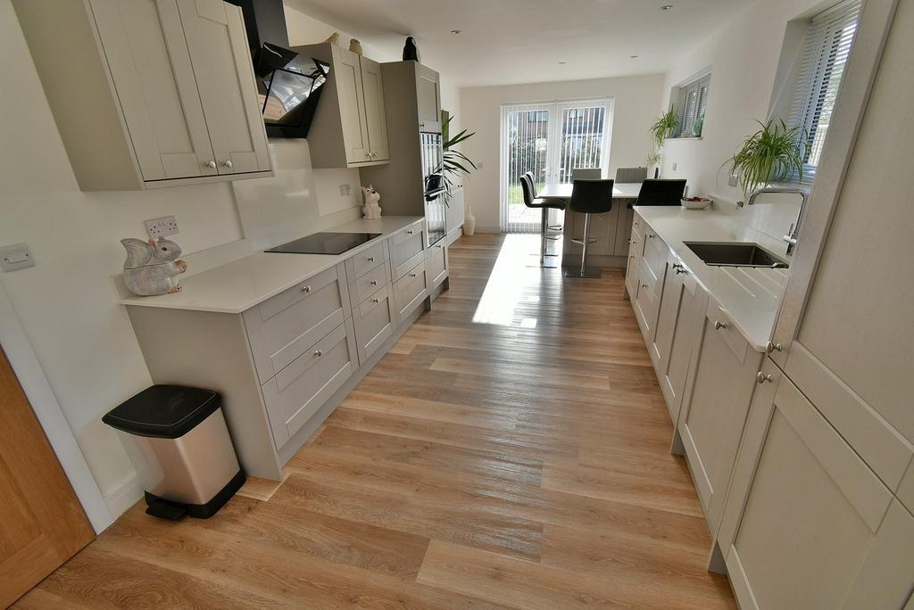• 23ft Dual aspect kitchen/dining room which has been beautifully finished with extensive Quartz worktops and matching upstands with an inset stainless steel sink, good range of base and wall units, a six seater breakfast bar also finished with a Quartz worktop and storage beneath. There is an excellent range of high quality Neff integrated appliances to include induction hob and extractor canopy above, oven and combination microwave grill oven, dishwasher, fridge and freezer. Double glazed French doors open out to a front patio area