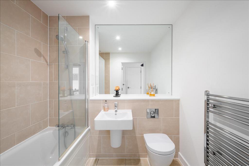 The stylish family bathroom comprises a three-piece suite with shower-over-bath, floating sanitaryware, a fitted mirror with storage shelf, and a heated towel rail.