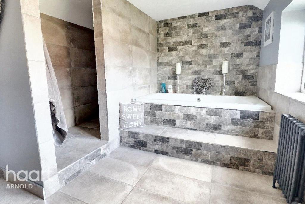 Opaque UPVC double glazed window to the rear, high-level flush W/C, vanity unit wash basin with fitted storage underneath, a sunken bath with tiled surround, walk-in shower enclosure with an overhead rainfall shower, tiled flooring with underfloor heating, radiator, and chrome heated towel rail.