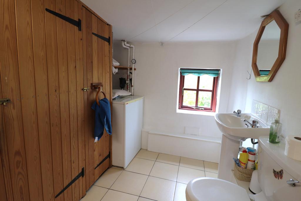 (8'8" x 7'2")(2.64m x 2.18m) With a west-facing low double glazed window, with roller blind and views over open grassland opposite, and a low ceiling with exposed joists. Fitted with a white suite of close coupled w.c. and pedestal handbasin. Warmflow oil fired combination boiler, providing hot water and central heating. Three pine doors open to built-in cupboards with space for a washing machine. Ceramic tile floor.