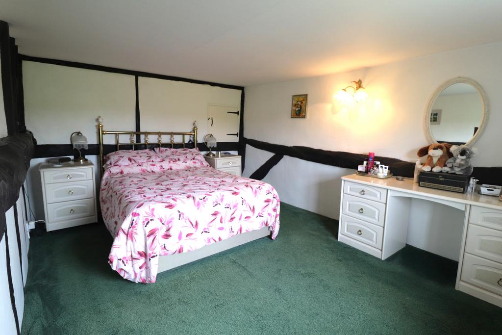 (11'2" max, 10'6" min x 8'8", 10'7" to door recess)(3.4m max, 3.2m min x 2.64m, 3.23m to door recess) With an east-facing double glazed window, overlooking the gardens and a smooth ceiling, with a height of 6'4"(1.93m). Exposed wall studs, cross-beam and red brickwork to the chimney breast, and an old pine ledged door, give much character to this room, which has a radiator with thermostatic valve, fitted carpet and a long mirror to the front of an old pine ledged door to a walk-in wardrobe, to the side of the chimney.