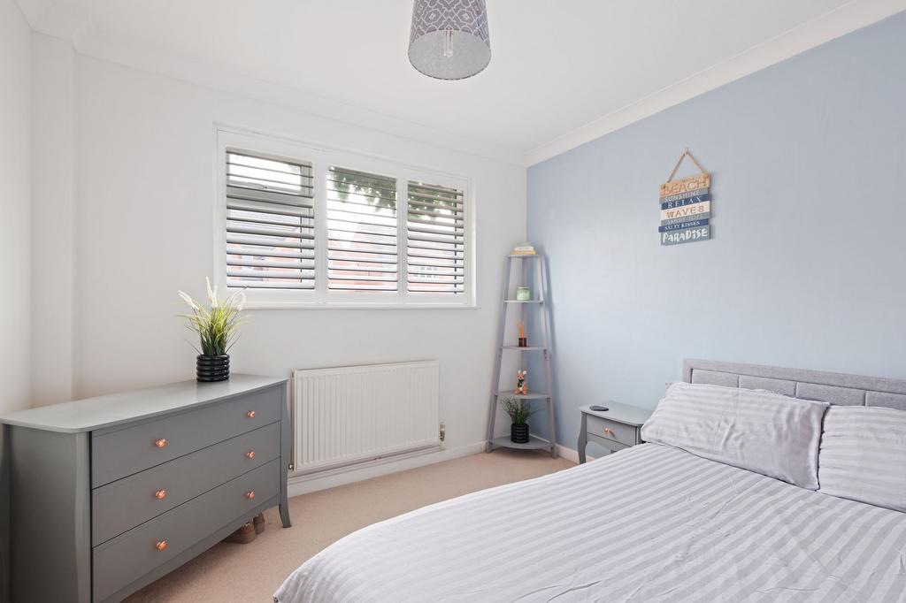 Inside, the kitchen is the heart of the home. It features fitted window shutters, space for a two-seater sofa, and both base and eye-level shaker-style units. Built-in appliances include a dishwasher, oven, and hob. From the kitchen, you can access the hallway, which leads to one of the bathrooms (with a shower over bath, WC, and basin), a well-equipped utility room with space for both a washing machine and tumble dryer, and bedroom two. This double bedroom benefits from French doors opening into the private rear garden.