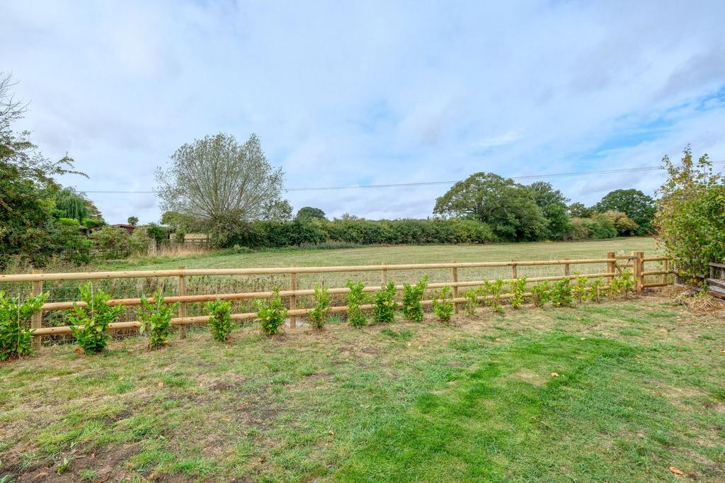 Outside, the private rear garden overlooks the countryside. The open space is a generous size with brick edging around the patio area, perfect for outdoor eating and entertaining, complemented by a charming bar area. The remainder of the garden is laid to lawn, dotted with low-level shrubbery and a small pond, creating a tranquil space to relax and enjoy the views.