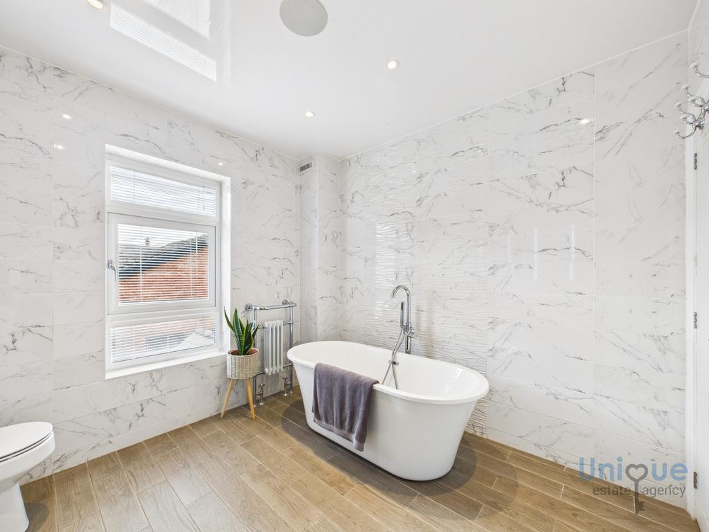 Stairs from the aforementioned hallway lead to a feature split level landing. There are three bedrooms, two of which are large double bedrooms on the first floor, the main bedroom has a walk in wardrobes, it could be converted into an en suite. The family bathroom is simply stunning, there is a 4 piece suite, which comprises of; stand along bathroom with feature taps which are plumbed from the floor, large walk in shower, double wash hand basin both set on a vanity unit, toilet.