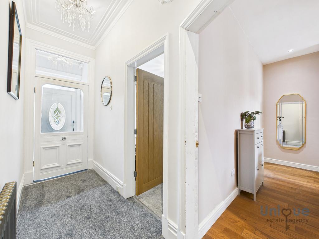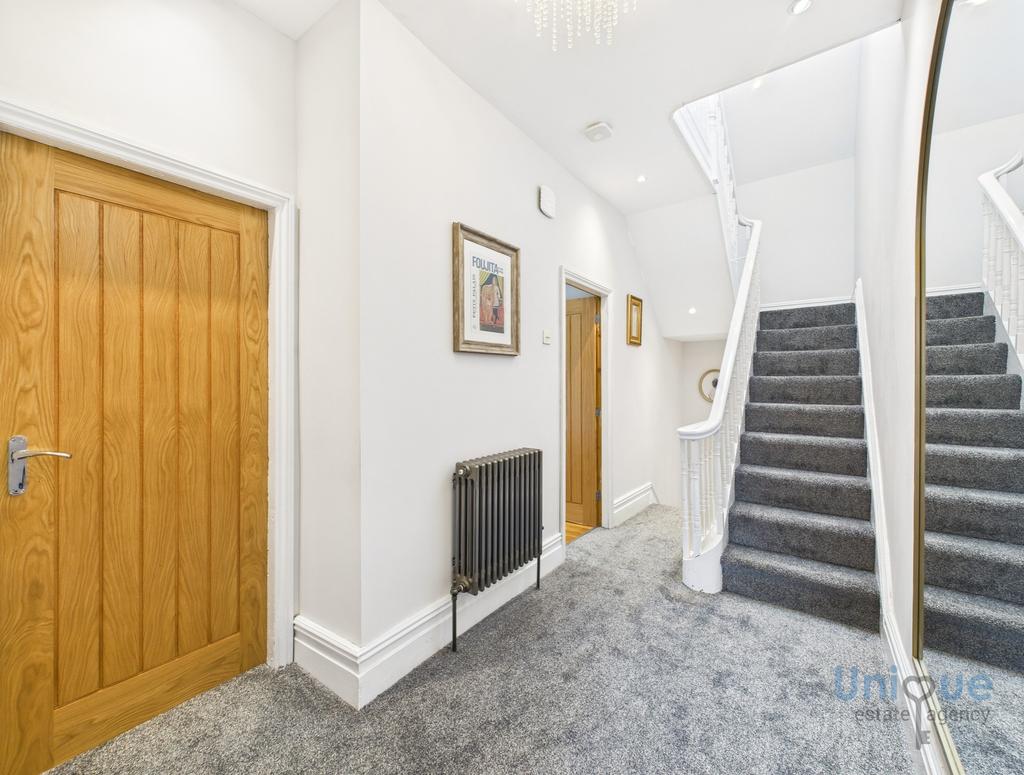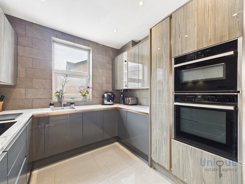 Front door opens on to entrance vestibule, inner door leads into an impressive hallway. The lounge is an excellent size, there is a stunning media wall with feature spotlighting either side, as well as a modern electric fire below, bay window to the front elevation. There is a 2nd reception room/formal dining room, French doors open on to the rear garden. Opening from the dining room leads in to a stunning modern fitted kitchen. The kitchen comprises a wide range of contrasting wall and base units with feature copper effect detailing, along with complementary marble effect worktops, modern inset sink, Neff double oven and grill, hob with overhead extractor, Fridge freezer, washer, door opens on to rear garden.