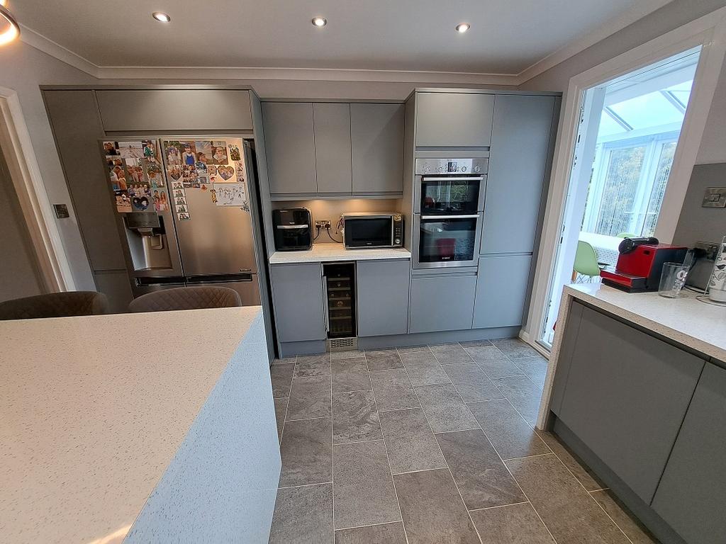 Modern square edge white mirror-chip granite style worktop with inset one and a half bowl single draining stainless steel sink unit with mixer tap, having two cupboards and an integrated full size BOSCH dishwasher under – behind matching concealing door. Feature matching worktop waterfall end panel with towel rail. Adjoining worktop with inset BOSCH ceramic hob, having six deep wide pan drawers, concealed large cutlery tray and two pull-out storage units under. Adjoining matching worktop with cupboard under which joins into a matching breakfast bar with cupboard under and also with a waterfall matching end panel and comfortable seating for 4 people. Further matching worktop with two cupboards and a wine cooler under. Tall double cupboard unit. Tall larder cupboard unit. Tall housing unit with built-in BOSCH stainless steel double oven, having a cupboard above and below. LG American style double door fridge / freezer included with water, ice and crushed ice dispenser. Extensive range of wall cupboards. Cornice and plinth work to wall units with under cupboard lighting. Glass cooker splashback. Stainless steel and glass cooker extractor canopy with spotlights. Coved ceiling. Attractive Karndean slate tile effect flooring. Radiator. Seven recessed ceiling spotlights. Feature LED pendant light fitting above the breakfast bar. Stainless steel switches and sockets throughout, some with USB ports. Large UPVC double glazed window overlooking the rear garden. UPVC double glazed door at the rear leads into the conservatory.