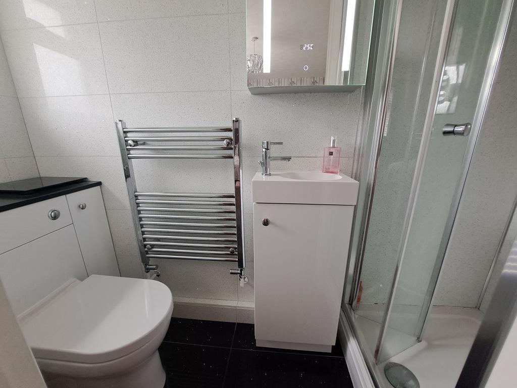 Stylish modern white suite comprising a walk-in shower cubicle with fitted white mirror chip shower panels and a fitted thermostatic mixer shower with concealed pipework and a rainfall shower head. Wash hand basin with mixer tap, having storage cupboard under and a dual flush push button WC with soft close seat and lid and a concealed cistern with granite effect worktop/storage area above and a built-in storage cupboard under. Radiator ladder towel rail. Attractive fully tiled walls with polished porcelain white mirror chip tiling and contrasting black mirror chip polished porcelain floor tiling. Extractor fan. Recessed ceiling spotlight. Wall mounted mirrored storage cupboard with led lighting, built-in shaver point and a digital clock & room temperature display. Opaque UPVC double glazed window.