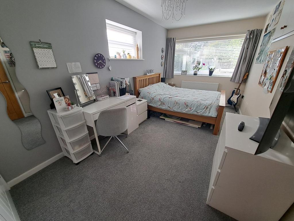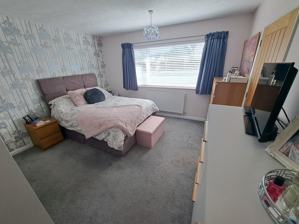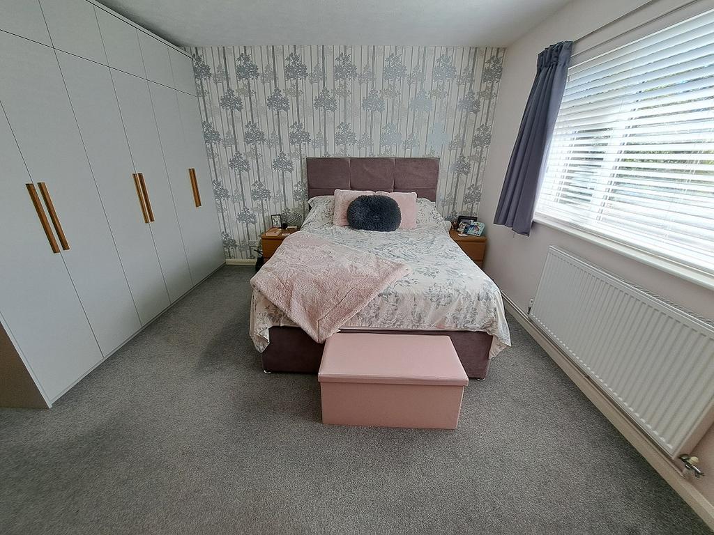 Large built-in double wardrobe with top cupboards over. Large alcove with fitted shelving. Double radiator. Built-in cupboard which houses the trip switches, electric meter and solar panel meter. Double aspect with a UPVC double glazed window to the side with a fitted wooden blind and a large UPVC double glazed window to the front with a fitted blind.