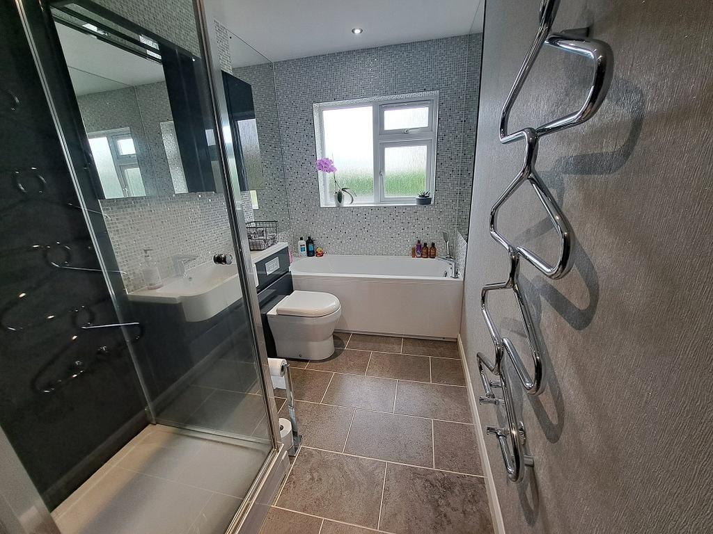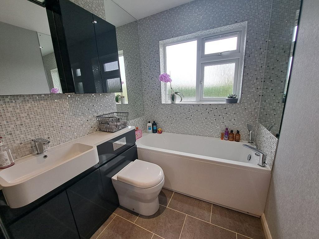 Stylish modern white suite comprising a panelled bath with mixer tap and a pull-out hand shower attachment, vanity style wash hand basin with mixer tap, having double cupboard under and incorporating the dual flush push button WC with soft close seat and lid and concealed cistern. Matching double cupboard wall unit and large wall mirror with motion sensor LED lighting. Separate walk-in shower cubicle with slate effect shower panels and a fitted thermostatic mixer shower with concealed pipework, having a rainfall shower head with waterfall option and an additional hand shower attachment. Three recessed ceiling spotlights. Attractive Karndean slate tile effect flooring. Designer radiator towel rail. Attractive partly tiled walls with mosaic glass blocks, tumbled marble and mirror squares. Extractor fan. Feature custom made wall mirrors at either end of the bath create an infinity effect. Large Opaque UPVC double glazed window.