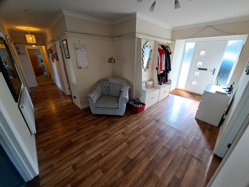 Coved ceiling. Radiator. Three ceiling lights. BT point. Picture rail / Plate rail. Wood effect flooring. Bespoke fitted coat and shoe storage with cupboards and seating area. Built-in airing cupboard with pressurised hot water tank system with immersion heater and slatted shelving. Overhead loft access with pull-down ladder leads to partly boarded loft space with an electric light. Tall opaque UPVC double glazed window either side of the front door. Digital room thermostat.