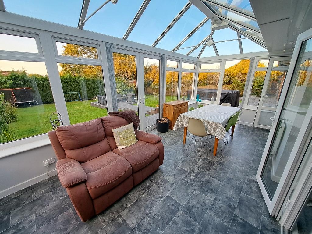Attractive slate tile effect flooring. Three ceiling lights. Power Points. Double radiator. Large triple aspect UPVC double glazed windows overlooking the rear garden. UPVC double glazed French Doors at the rear lead out to the rear garden and a UPVC double glazed door at the side also leads out to the rear garden. UPVC double glazed door also provides access to and from the kitchen.